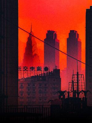 A cinematic view of the city bathed in deep red light, where towers and shadows dissolve into a dense urban atmosphere. An image of Chongqing as pure mood, heat and vertical energy, caught between reality and abstraction.